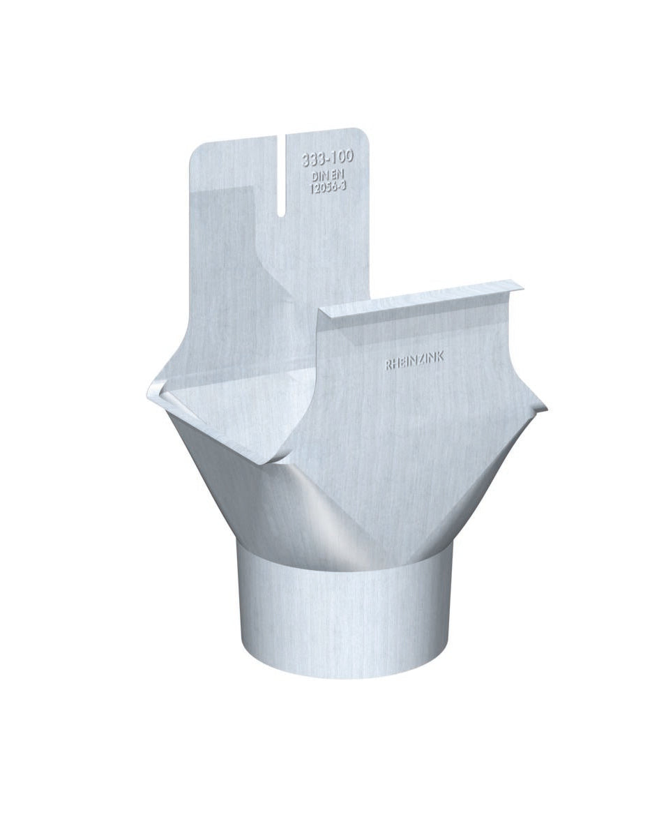 Kastenrinneneinhangstutzen aus Zink in Kasten Ausführung verbindet zuverlässig die Dachrinne mit dem Fallrohr. Er leitet das Regenwasser sicher vom Rinnenboden in das Fallrohr und bildet so eine funktionale sowie optisch saubere Lösung für die Dachentwässerung.