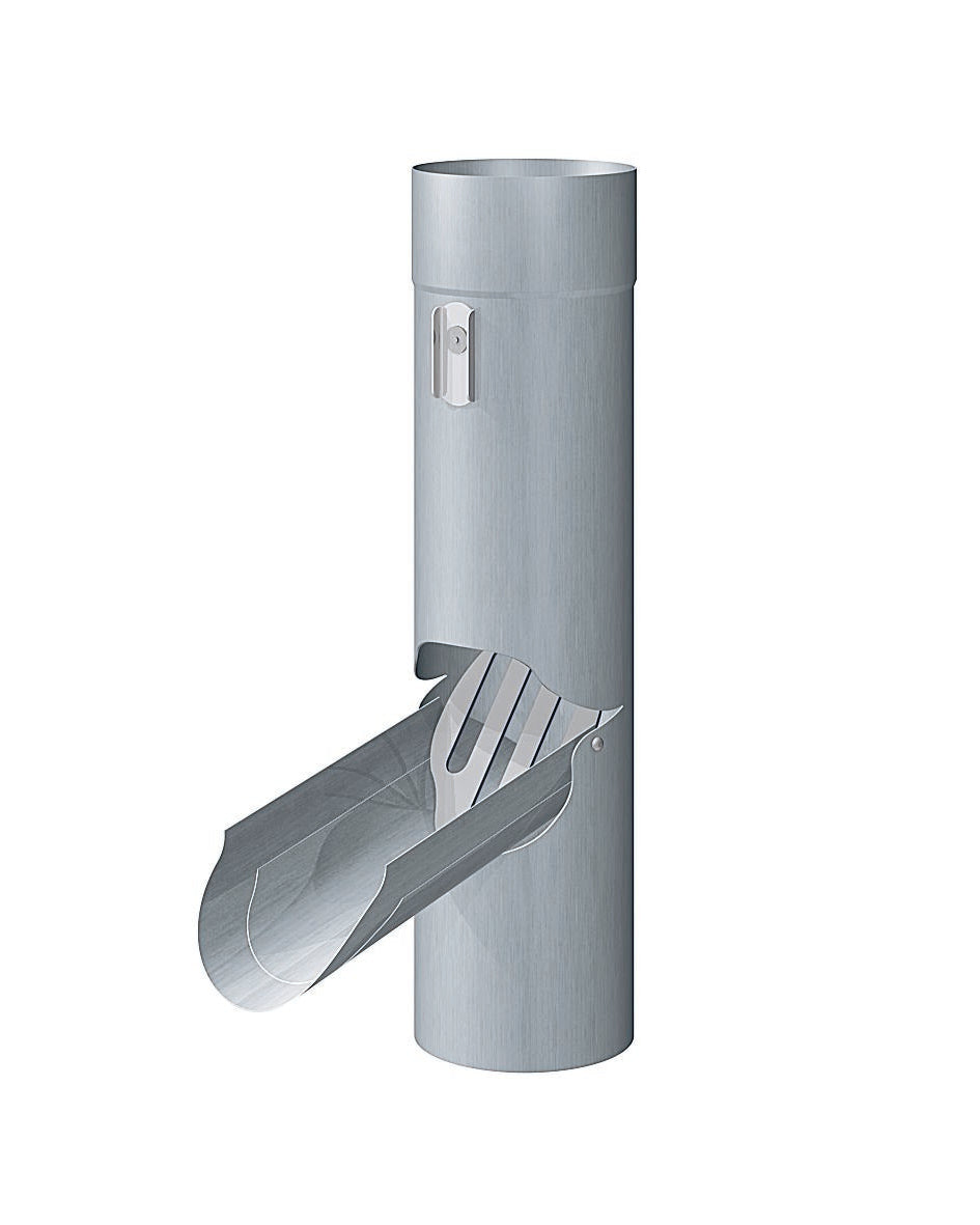 Der Regenwassersammler aus Titanzink wird direkt unterhalb der Dachrinne montiert und dient als Übergang zur Fallrohrstrecke mit integrierter Sieb-/Filterfunktion. Ideal zur Filterung von Laub und groben Partikeln vor der Einleitung in Zisterne oder Regenwasseranlage.